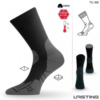 LASTING TCL - Středně slabá trekingová ponožka obsahující bavlnu a speciální polypropylenové příze s obsahem iontů stříbra, které zpomalují růst bakterií a plísní, potlačuje nepříjemné pachy a udržuje rovnováhu pokožky. Ponožka je upravena pro zlepšenou ochranu proti puchýřům a tepelnou izolaci. Horní část ponožky je z jednovrstvého hladkého úpletu. V celém chodidle je dvouvrstvý plyš, což má za následek vysokou mechanickou odolnost a ochranu nohy před otlaky. V nadnártní části je zóna podporující dopředný náklon.